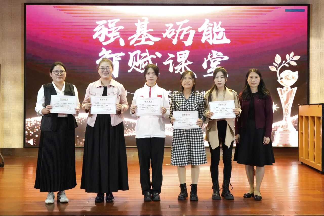 总结会上同步举行了颁奖仪式。经过评委团严谨评审,肖又赫、洪钰、胡馨月三位教师凭借扎实的教学基础、创新的 AI 应用及出色的课堂表现,荣获本次大赛一等奖;高语组张正君老师、数学组苏洁薇老师以扎实的教学功底与积极的创新探索,荣获二等奖。校领导为获奖教师颁发荣誉证书,勉励她们珍惜荣誉、再接再厉,充分发挥示范引领作用。