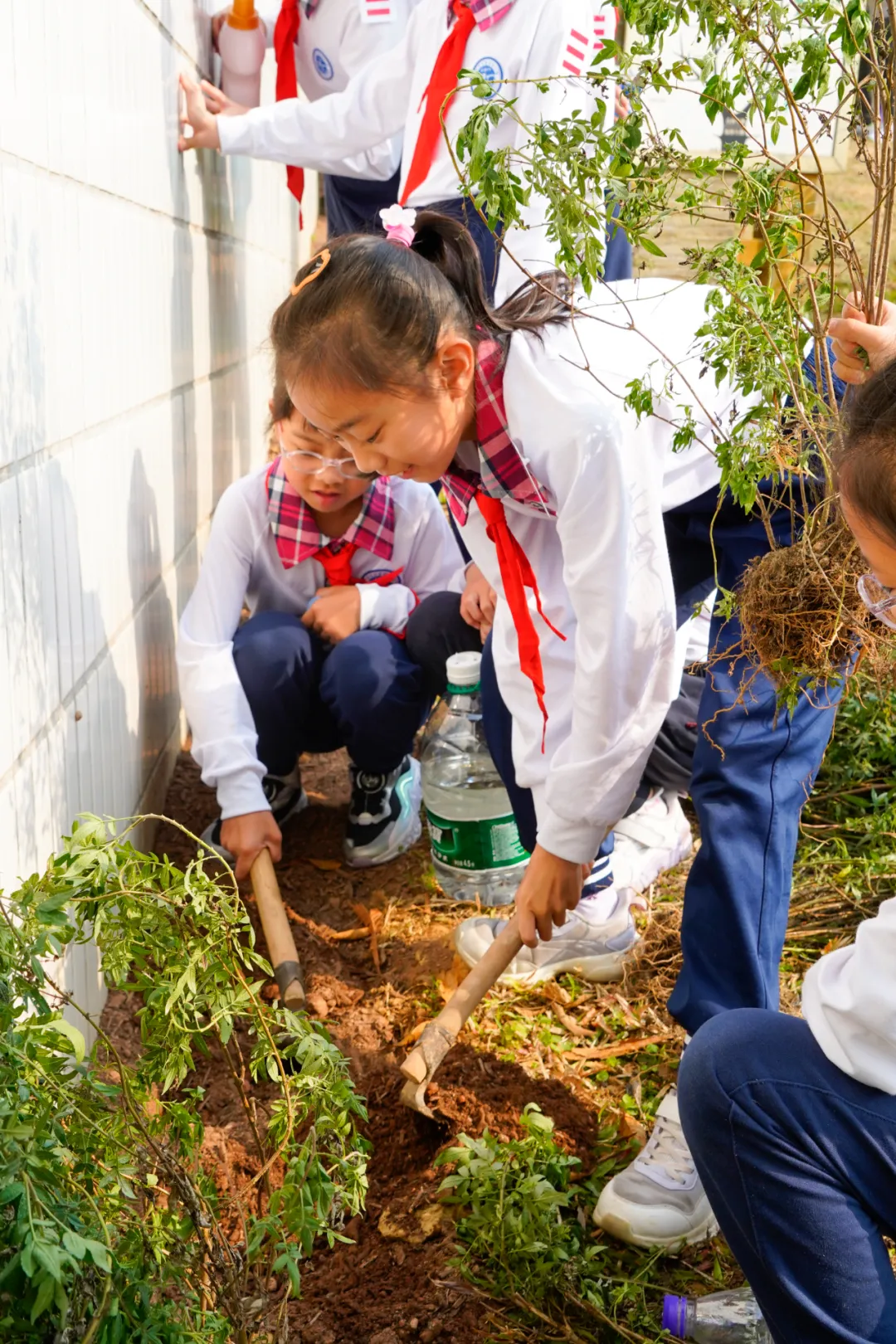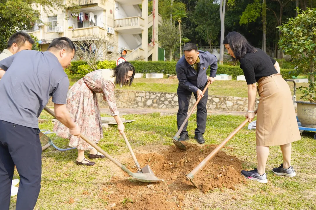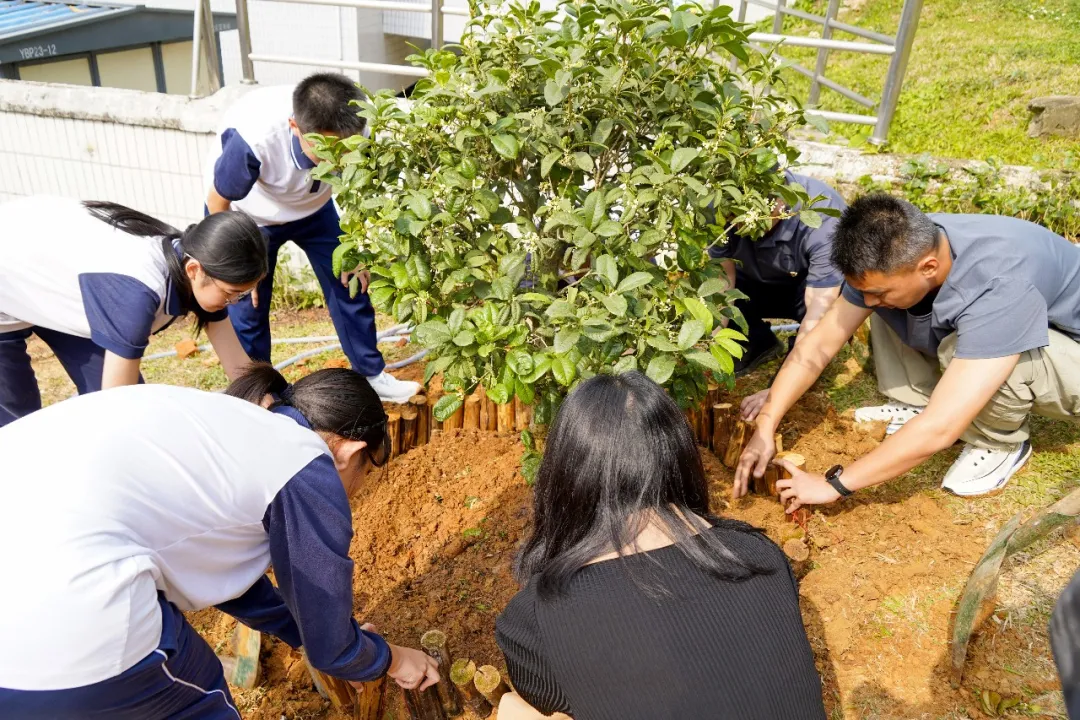 活动现场,党员教工充分发挥引领作用,一边示范种植技巧,细致讲解挖坑深度、培土方法等关键要点,一边监督安全操作,时刻提醒大家遵守工具使用规范,挖坑时保持1米间距,确保每一位参与者的安全。团员们专注负责桂花树的种植,挽起衣袖、奋力挥锹,小心翼翼地搬运树苗、调整树苗角度,精准完成固定树干、捆绑支撑木桩等体力活,动作娴熟有力,尽显团员的责任与担当;少先队员们则承担起小型花草的种植任务,俯身细致栽种茉莉、万寿菊、海棠等幼苗,小心翼翼地培土、抚平土壤,缓慢浇水,生怕损伤娇嫩的花苗。党、团、队成员分工协作、默契配合,在实践中凝聚团队力量,完美践行“大手拉小手”的活动理念,欢声笑语久久在生态园周围回荡。