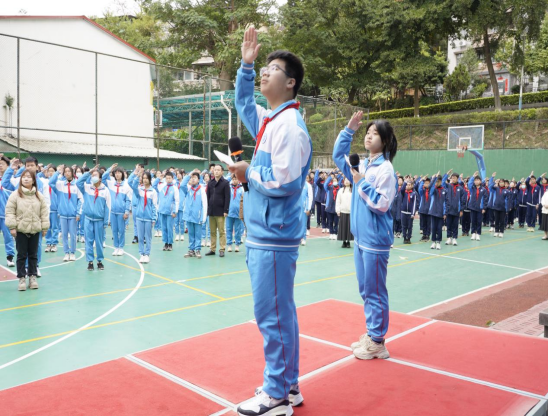 第一项:早上八点半,在小操场,我们举行了庄严的升旗仪式。主持人叶子茁、陈卉娜宣布升旗礼开始。