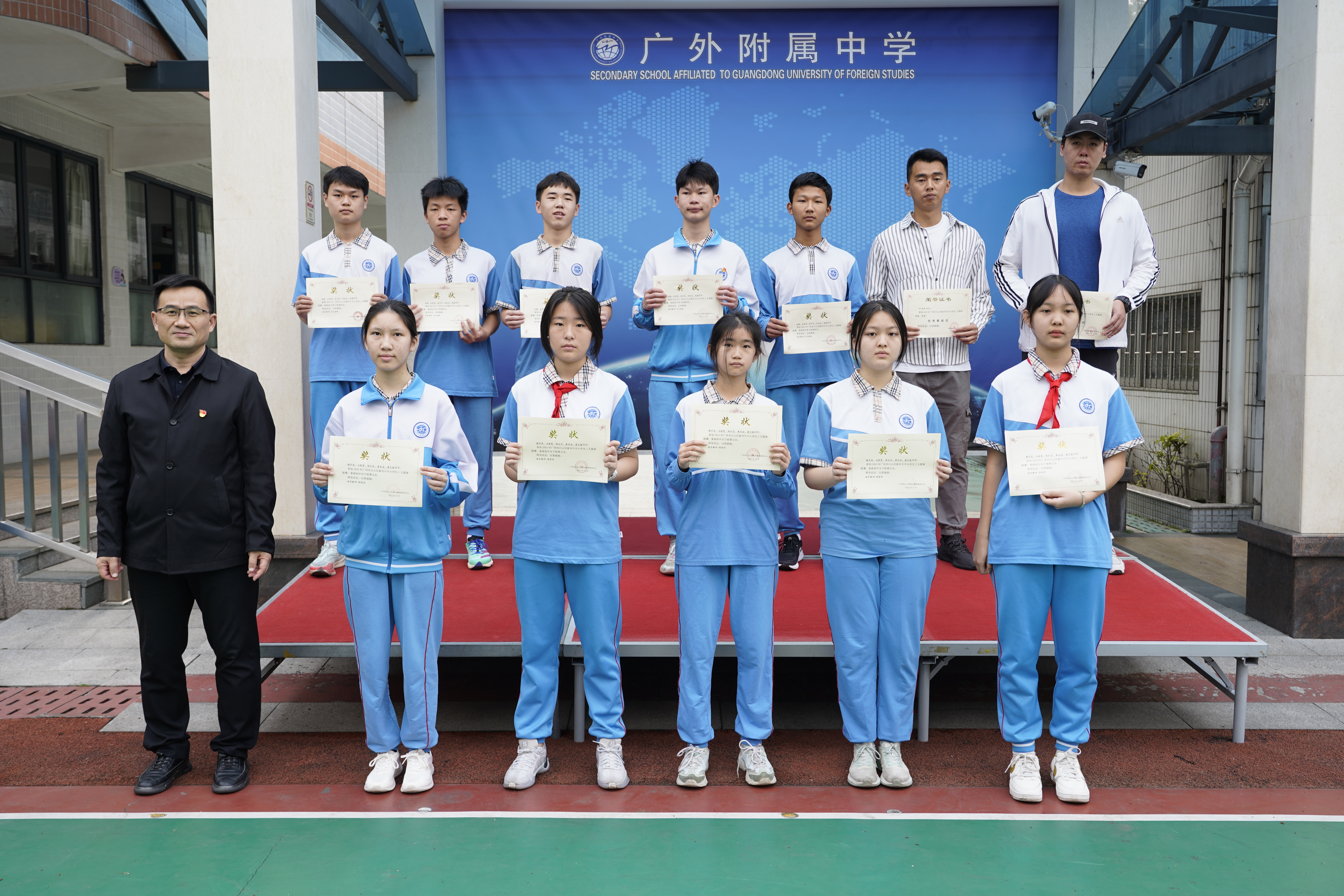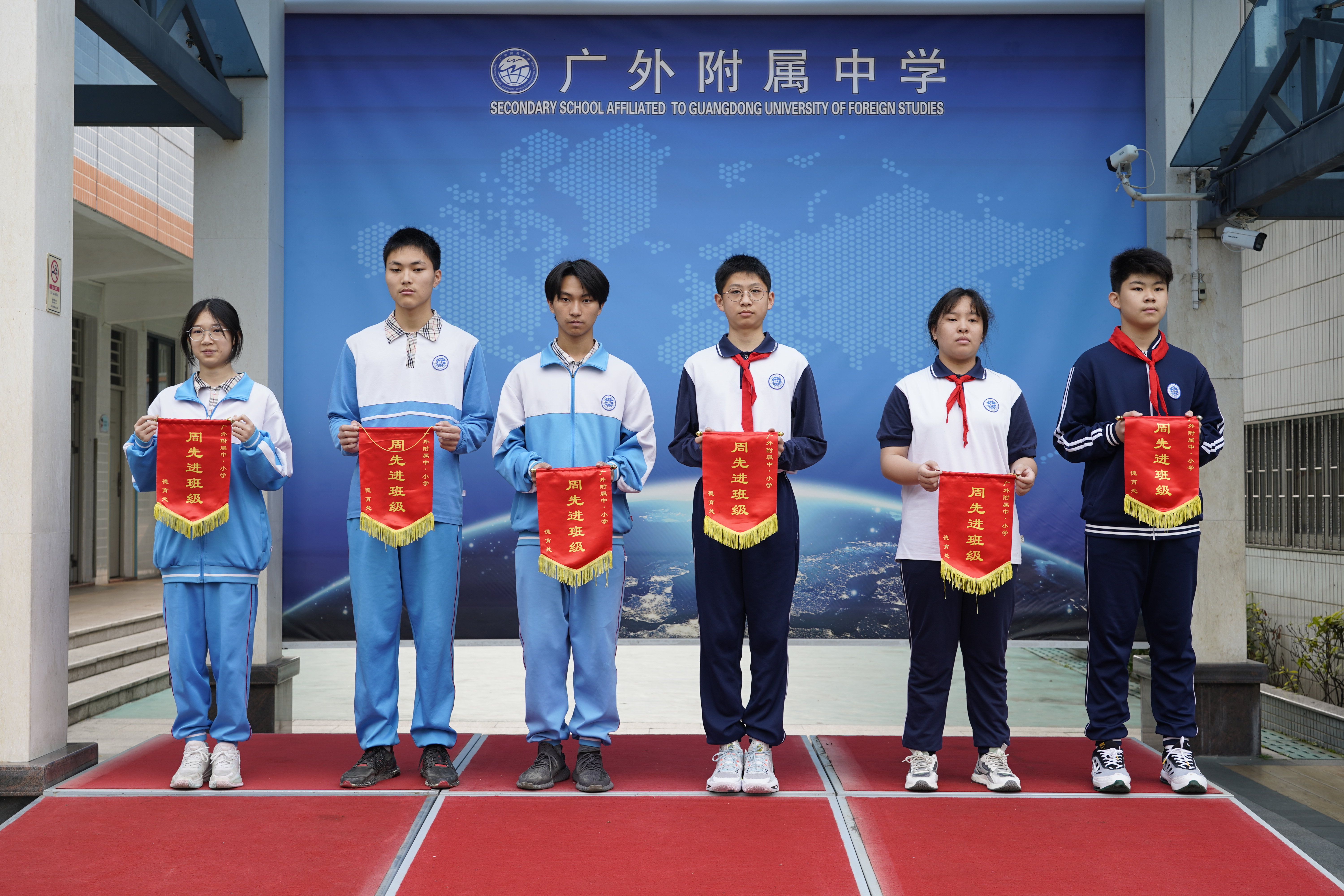 最后颁发上周流动红旗,获流动红旗的班级是:初三2、初一2、初一3、初一4、初三1、初三3,祝贺获奖班级。