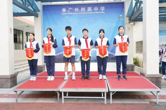 最后,颁发流动红旗。获得上周流动红旗的班级是:初一(1)班、(3)班,初二(1)、(2)、(3)、(4)班。