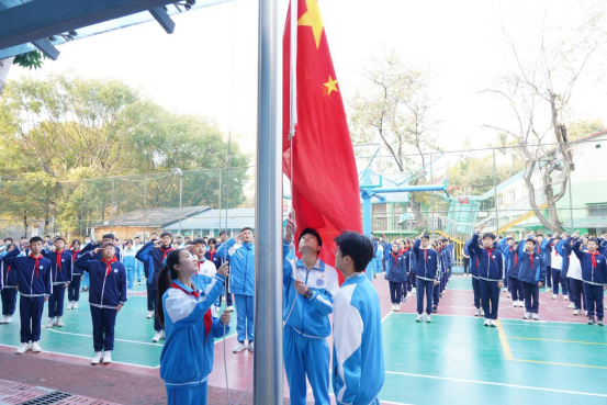 随着雄壮的国歌声响起,五星红旗在护旗手的护卫下缓缓升起,全校师生肃立,面向国旗行注目礼,心中激荡着对祖国无限的热爱与敬仰。