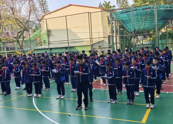 文明行为: 不乱扔垃圾,不随地吐痰,爱护公共设施,遵守公共秩序。课间休息,不串班不打闹;集会进退有序,安静倾听;同学之间自尊自爱,举止得体,保持分寸,尊重他人感受。”同学们坚定的宣读声在整个操场回响。