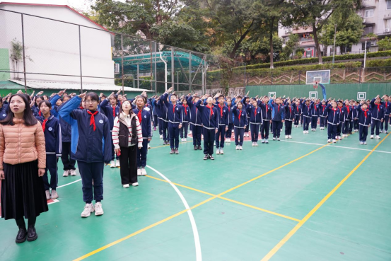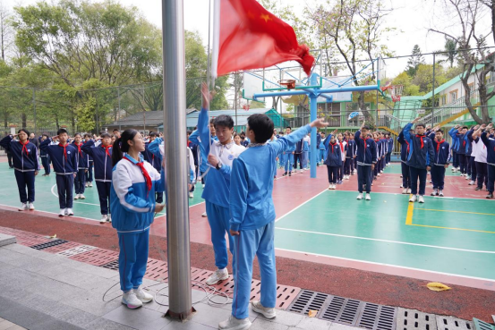 清晨8时20分,升旗仪式在庄严的国歌声中拉开帷幕。国旗护卫队成员身姿挺拔、步伐铿锵,护送五星红旗入场。全体师生肃立注目,齐唱国歌,鲜艳的国旗迎着朝阳冉冉升起,点燃了师生心中对祖国的热爱与崇敬。