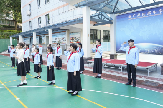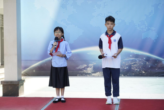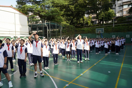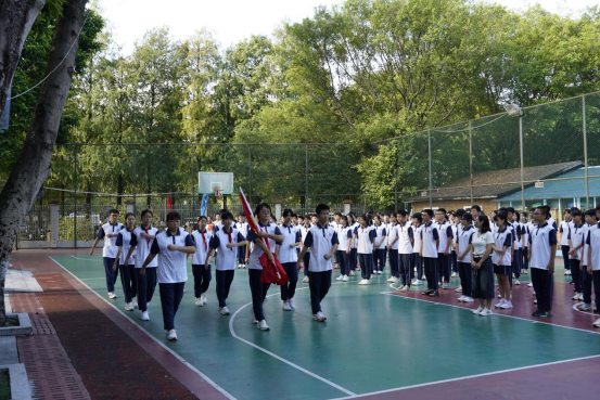 清晨8时,全校师生列队肃立。国旗护卫队迈着铿锵步伐护送五星红旗,在《义勇军进行曲》中,鲜艳的国旗与朝阳同升。全体师生高唱国歌,向先烈致敬。