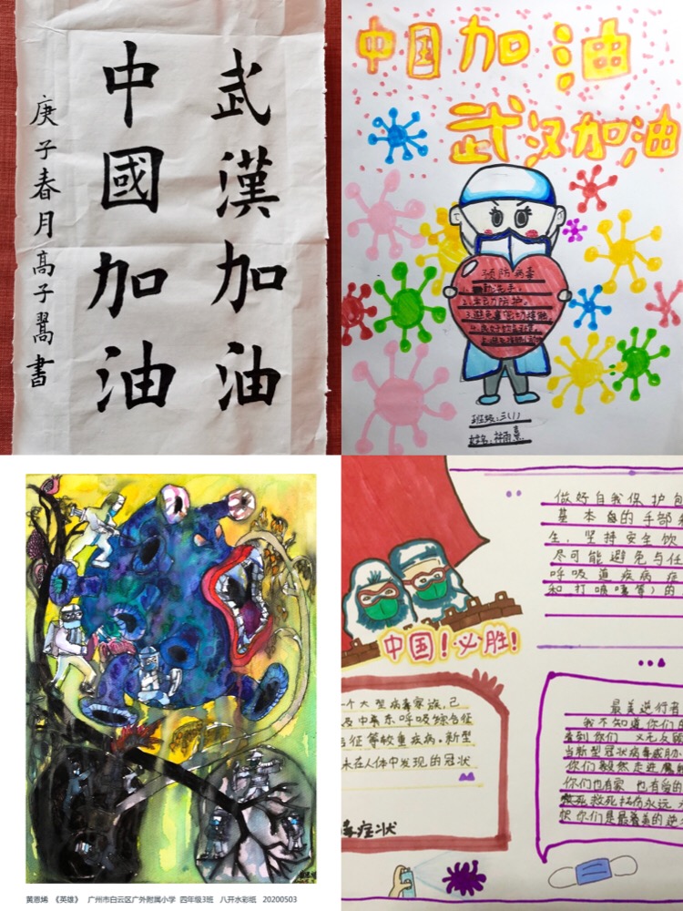 当孩子们用稚嫩的小手创作出一幅幅歌颂抗疫英雄的绘画、书法、手抄报等作品时,这背后都有一位党员美术教师的辛勤指导。黄婧老师以《我用画笔来抗“疫”》为主题,通过不同绘画形式的作品,与孩子们一起探索学习美术知识在抗击疫情主题画中的运用,并引导学生感受和大胆表达自己真挚的情感。她向学生传递正能量,倡导用绘画的方式为这场没有硝烟的战“疫”贡献一份力量。