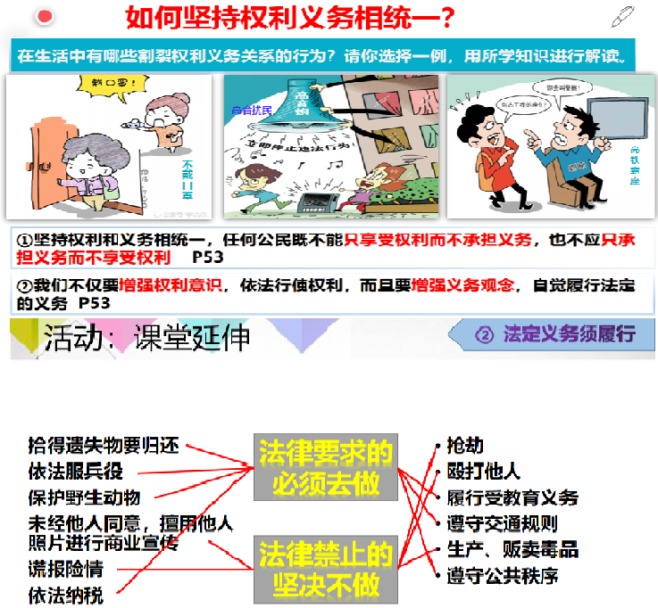 党员许燕敏是初二年级的道德与法治课老师。在网课教学中她以疫情为背景,紧密联系现实,借助党和政府采取的果断措施帮助学生理解中国特色社会主义制度的优越性和新时代的“抗‘疫’精神”。通过抗疫漫画让学生认清权利与义务密不可分,行使权利的同时也要履行义务,自觉戴好口罩、不出门,并劝阻身边的人积极履行相关义务,积极配合疫情防控工作。