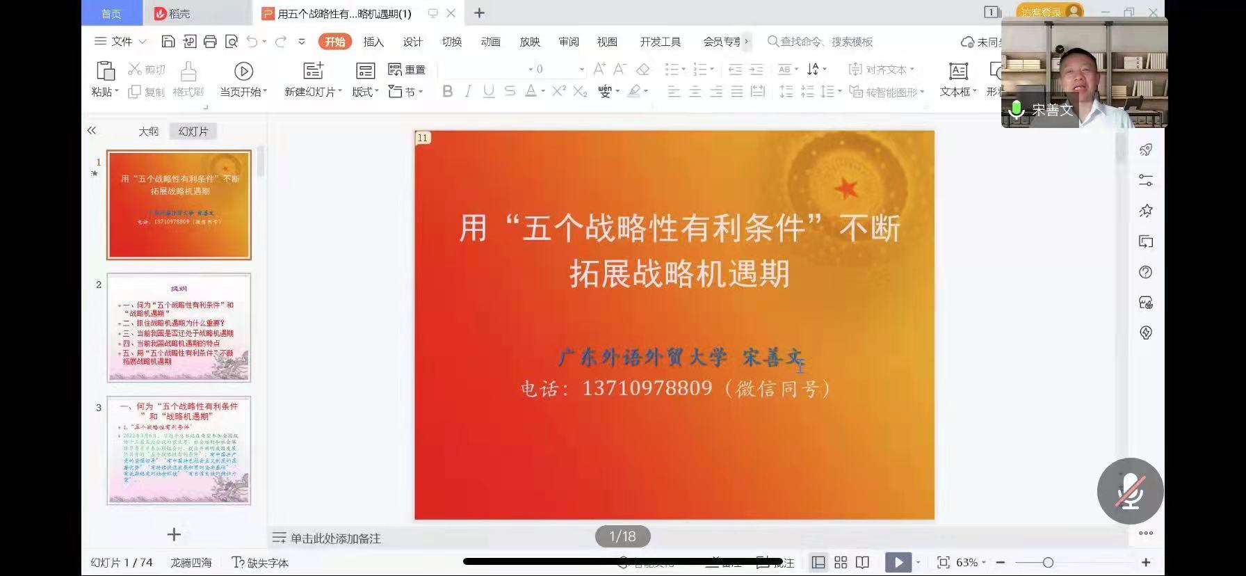 讲座特别邀请了广外马克思主义学院宋善文教授作为主讲嘉宾。宋教授作了题为《用“五个战略性有利条件”不断拓展战略机遇期》的精彩讲座。