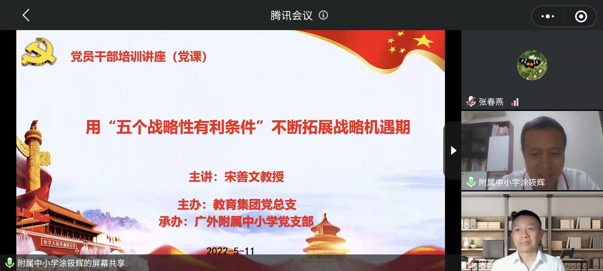 为了让支部广大党员、积极分子们能够更深入理解 “五个战略性有利条件”的重大论断,切实抓住并用好“五个战略性有利条件”,结合教育集团党总支中心组扩大会议暨党员干部培训系列活动,由教育集团党总支主办,附属中小学党支部承办的党员干部培训讲座于5月11日通过线上形式举行。