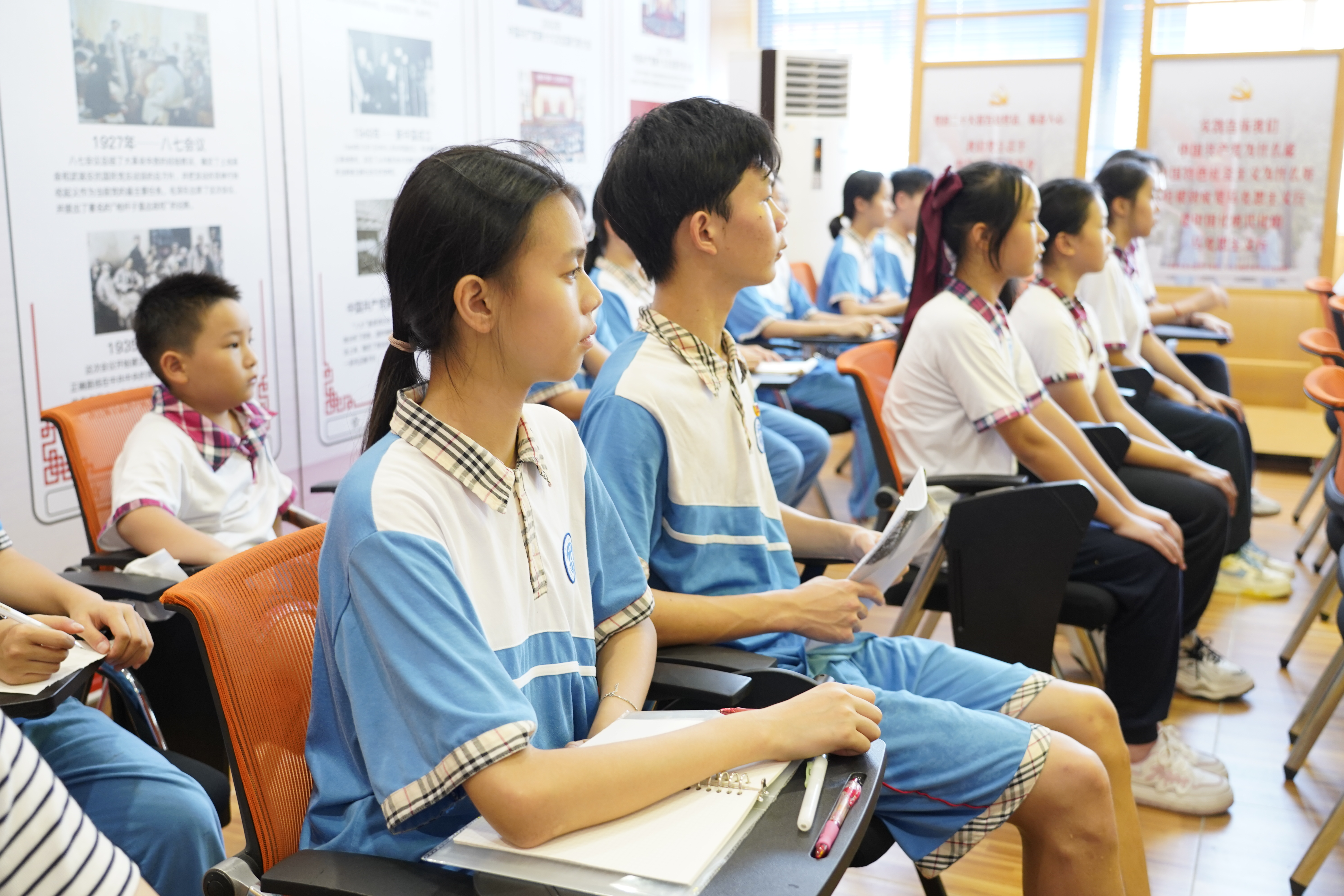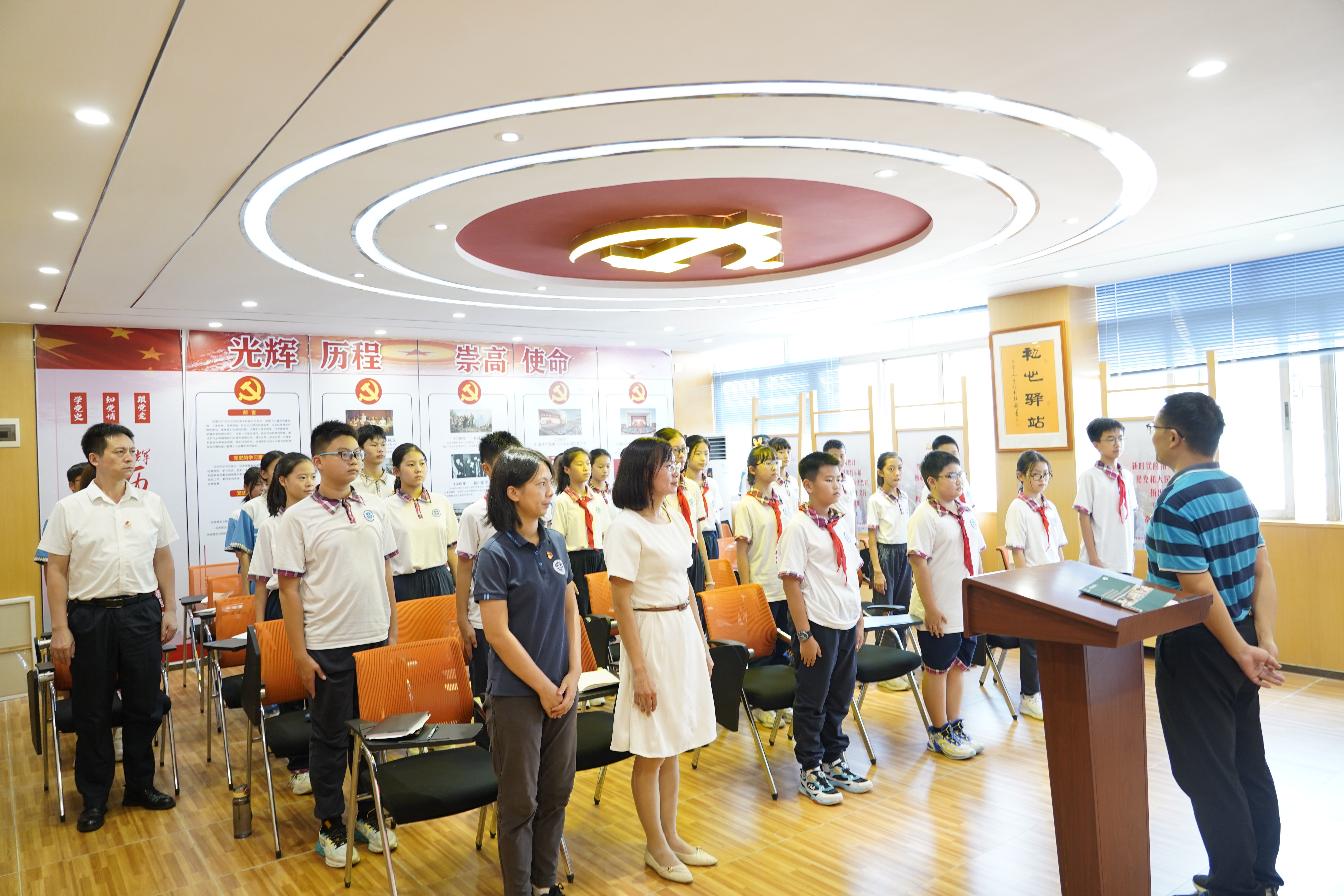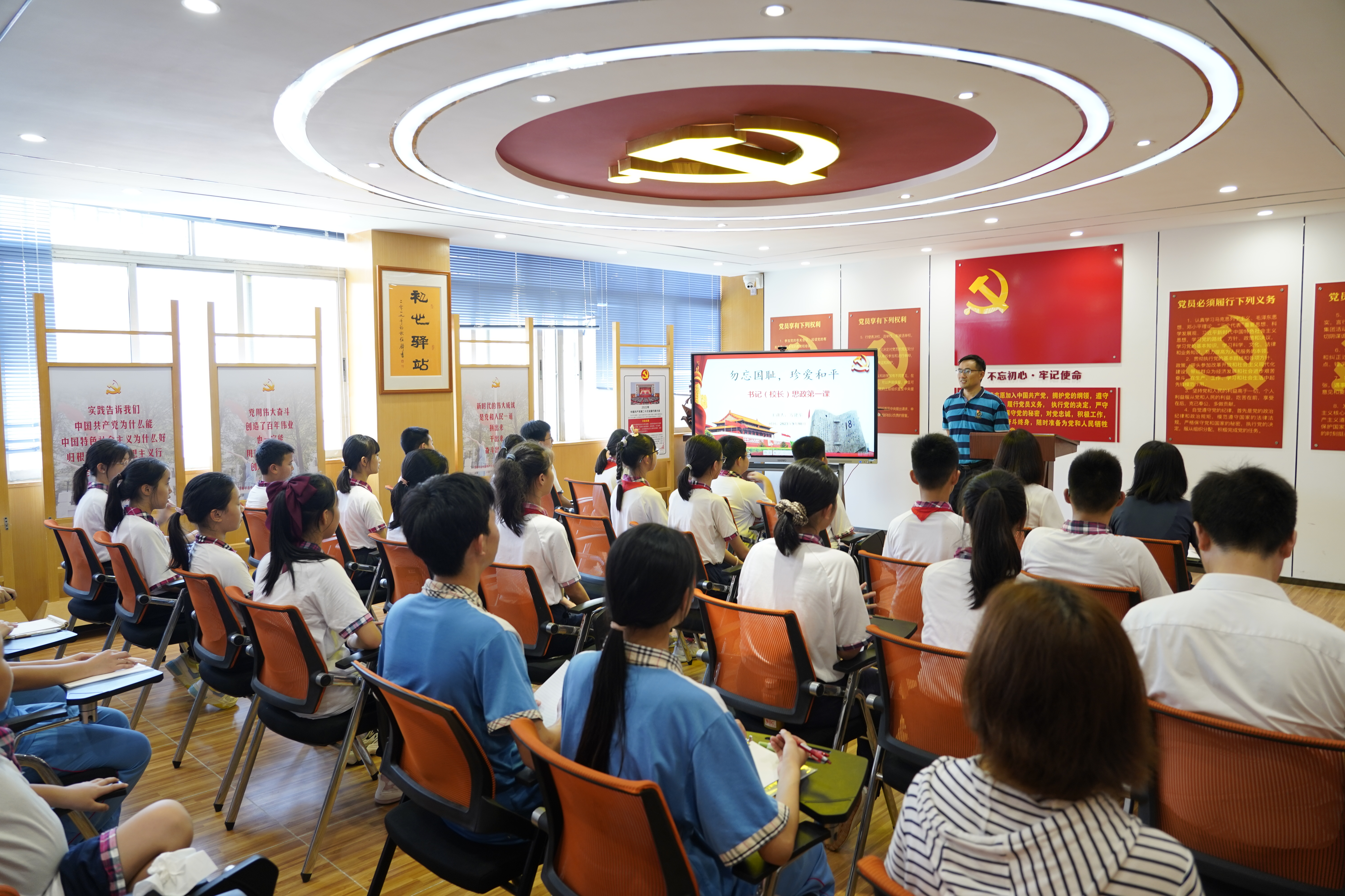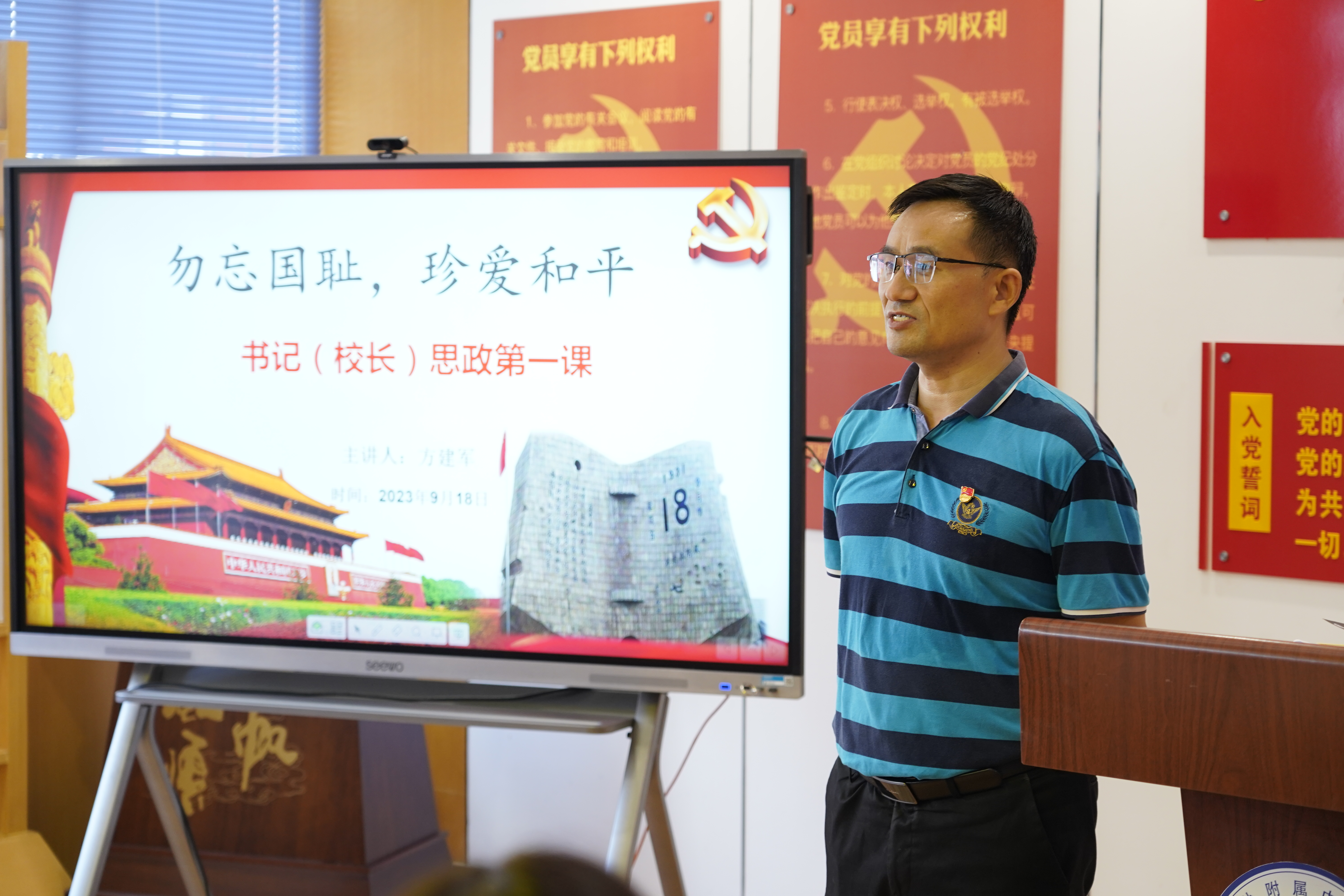 本网讯 9月18日中午,学校党支部书记方建军以《勿忘国耻 珍爱和平》为题,在党群活动室为30余名中小学生代表讲授“思政教育”第一课,共同纪念九一八事变92周年。