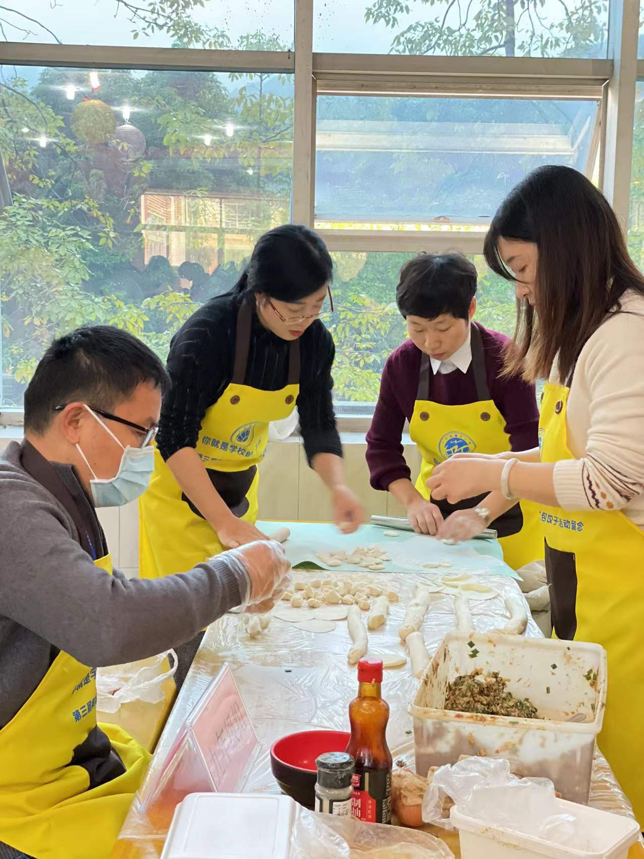 10:15,比赛正式开始。只见各组人员分工明确,调馅、揉面、擀皮儿、包饺子、摆盘等工序有条不紊。活动现场气氛热烈,附校的老师们不仅上得了课堂,而且下得了厨房,大家纷纷亮出绝活。看,她们动作娴熟,馅一放,手一捏,一个寓意吉祥如意、财源滚滚的元宝饺子就完成了;有的包了弯弯的月牙饺子,寓意着花好月圆......不一会儿,就像变戏法似的,一个个形态各异的饺子如“士兵”般排排站立,颇有“一声令下,勇往直前”之势。