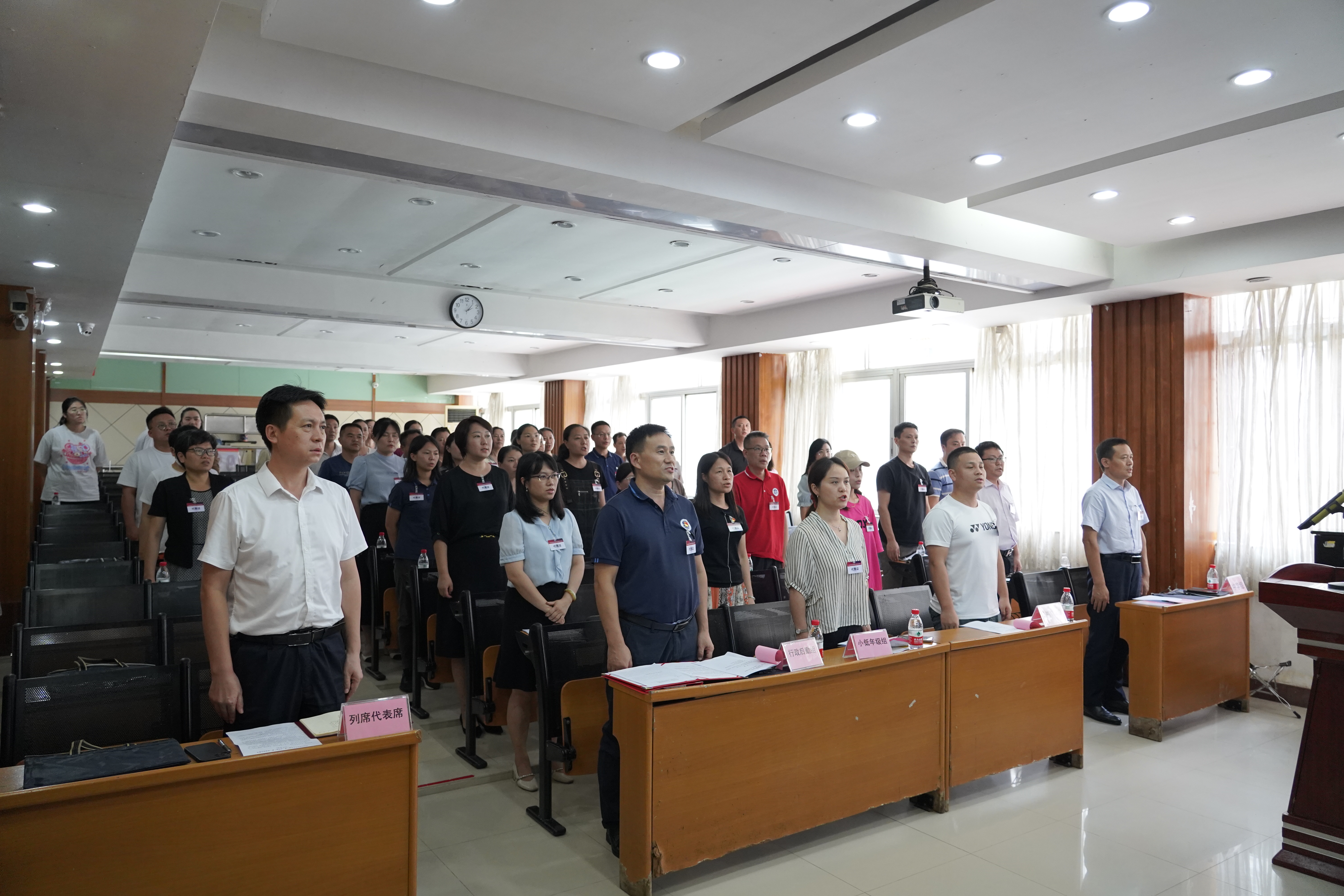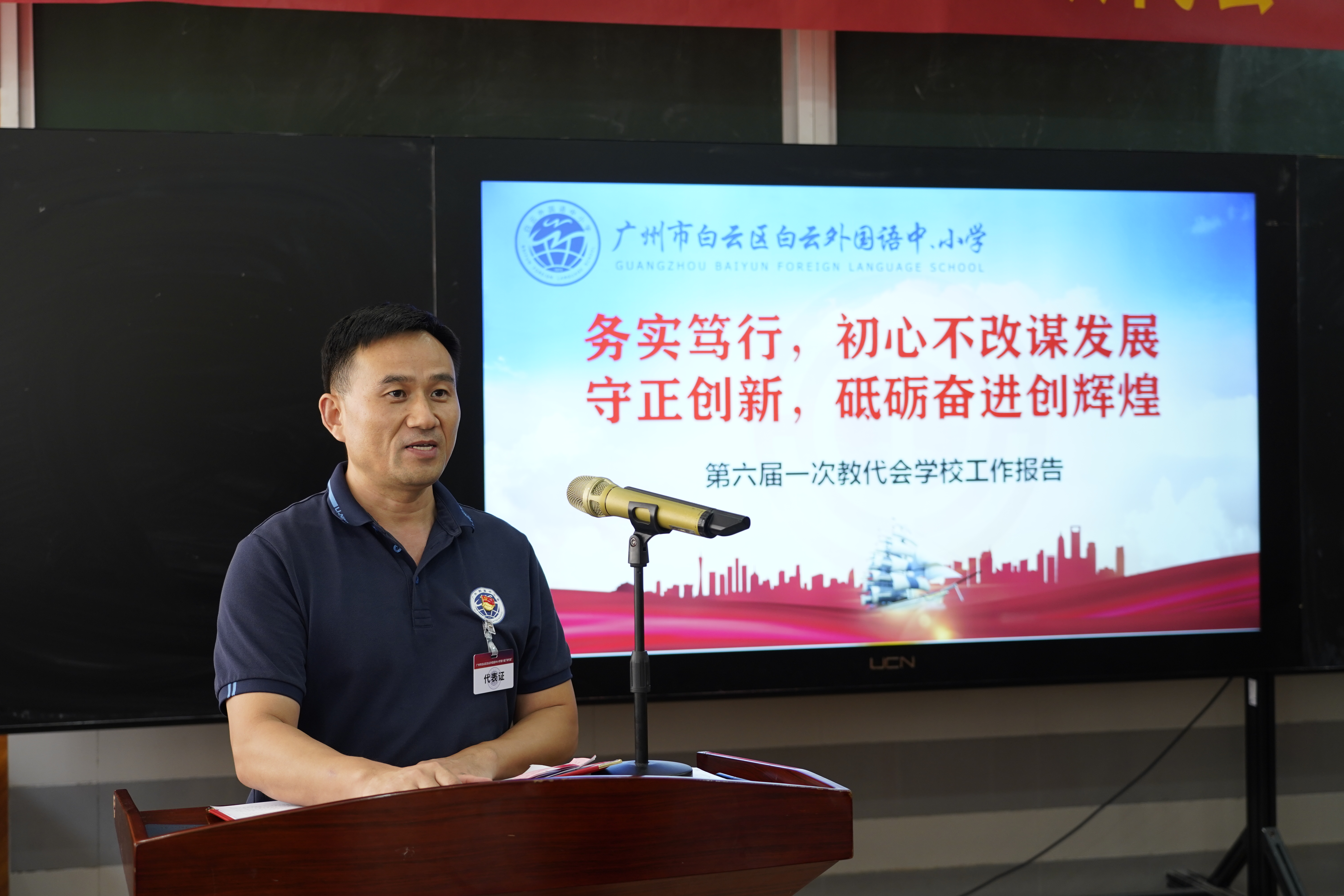 白云外国语中小学第六届“双代会”第一次会议在庄严的国歌声中拉开帷幕。