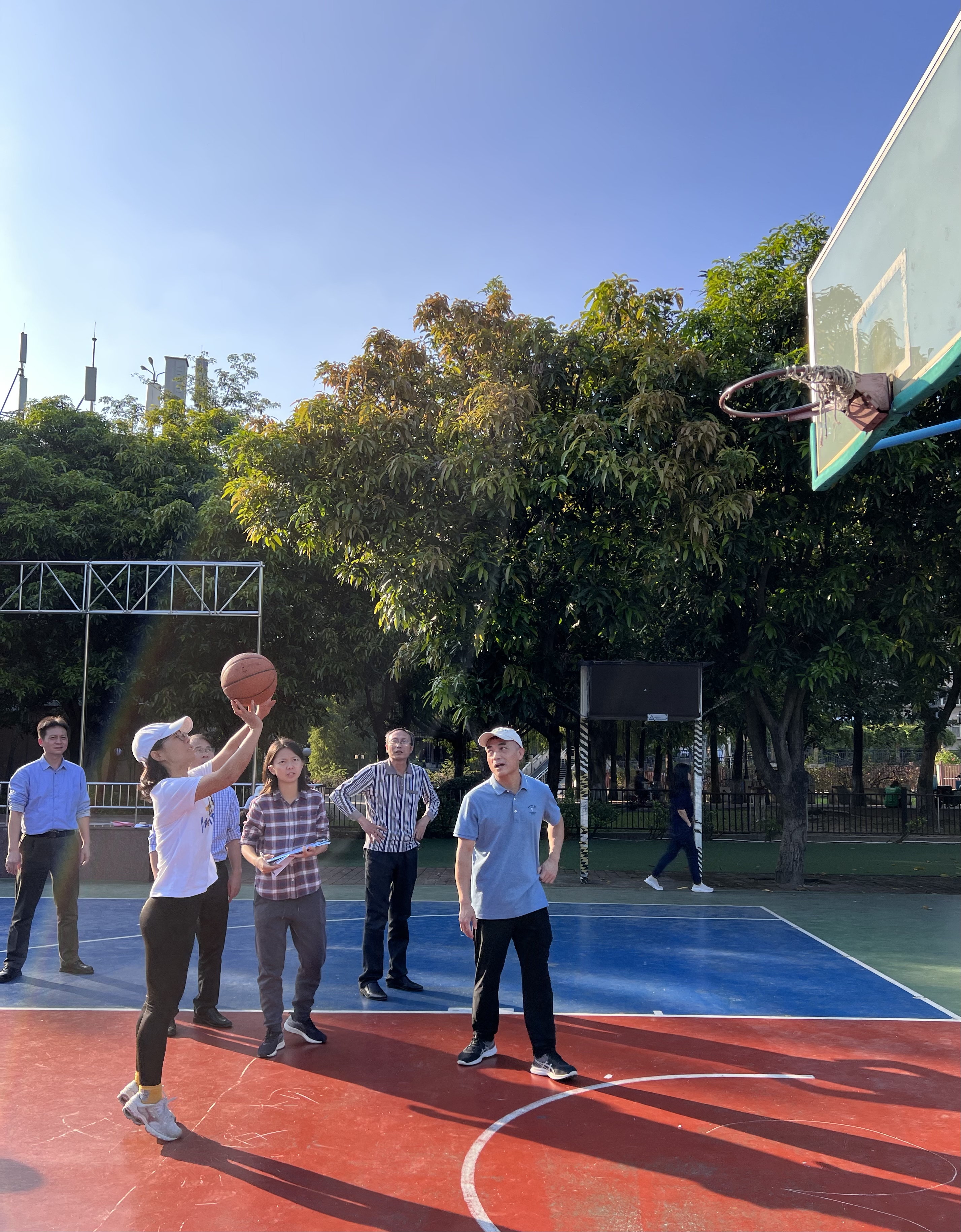 “定点投篮”不计时,按照每人2个球进行投篮,最终取每队投中的总球数计入团队积分。只见选手们将注意力集中在篮筐上,不断调整出手弧度,投篮姿态,利用一切方法投出手中的球,三不沾、打铁频频出现,惹得周围观众大笑不已。