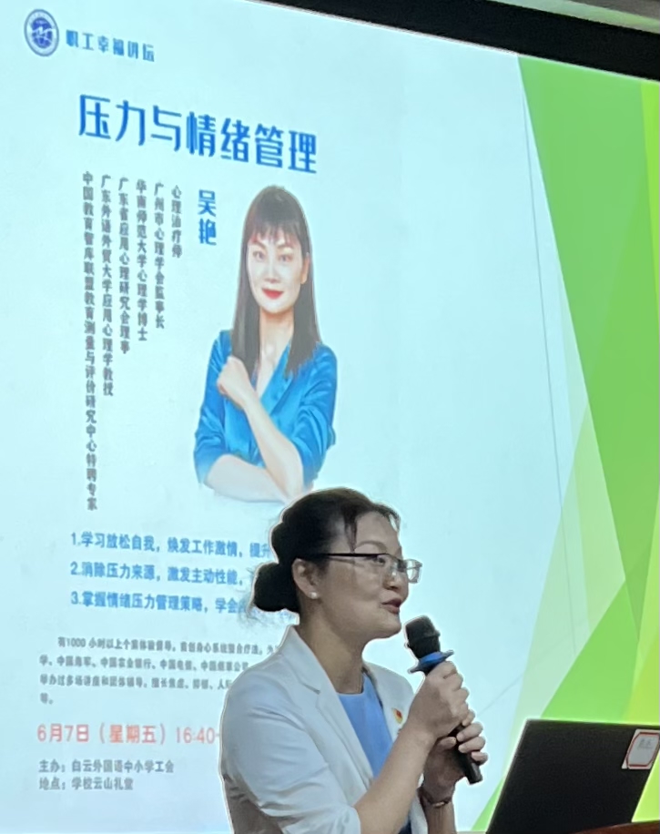吴艳教授还强调了心理健康的重要性,指出健康的心理状态是职场成功的关键。她鼓励老师们关注自己的内心世界,平衡物质和精神需求,追求真正的幸福。