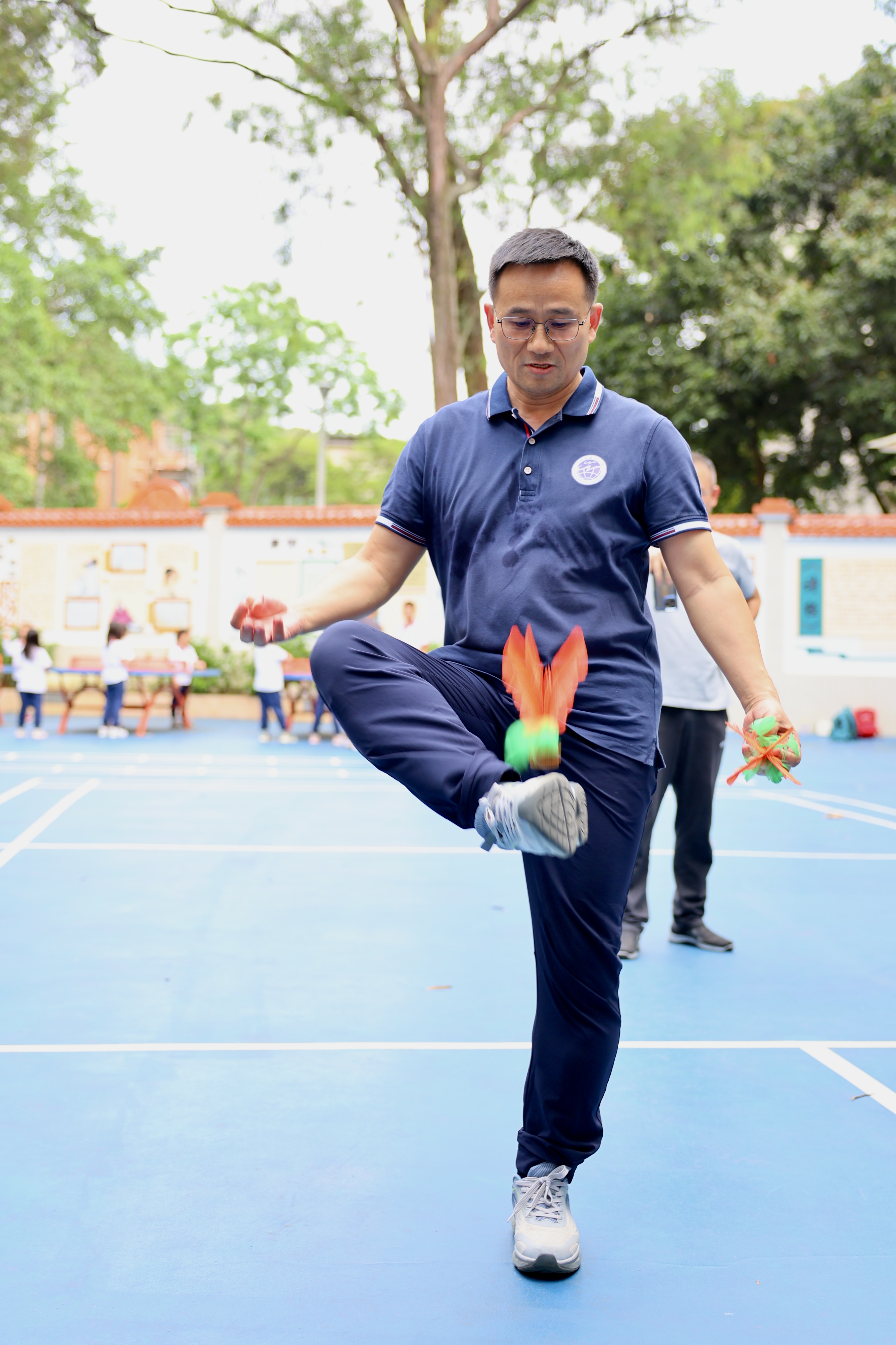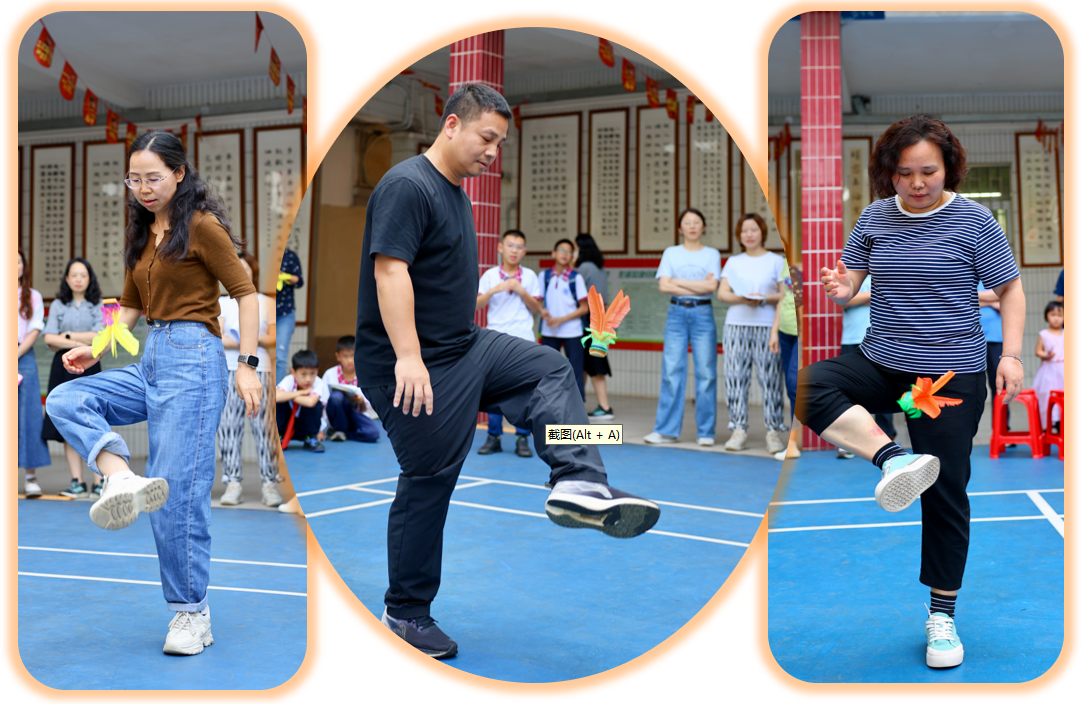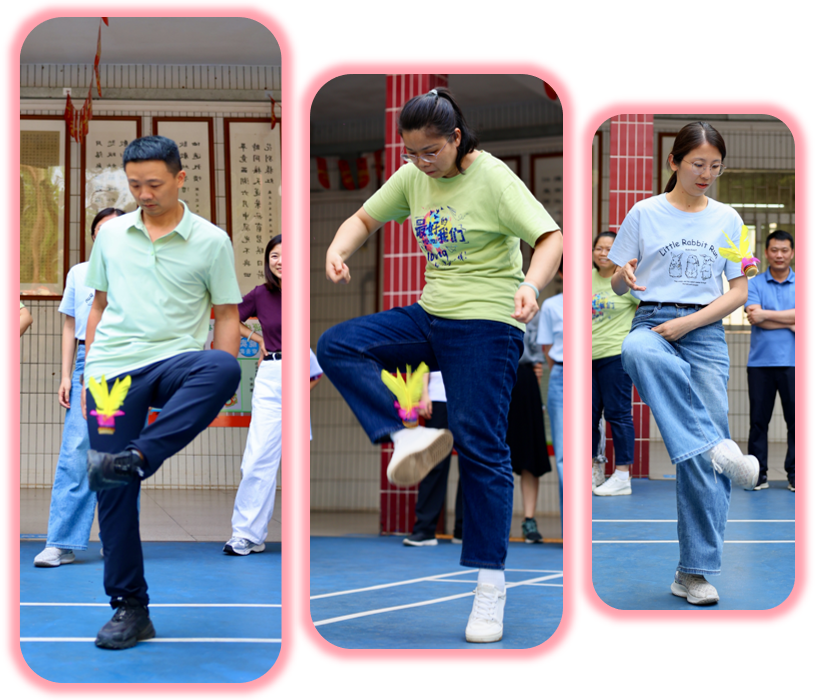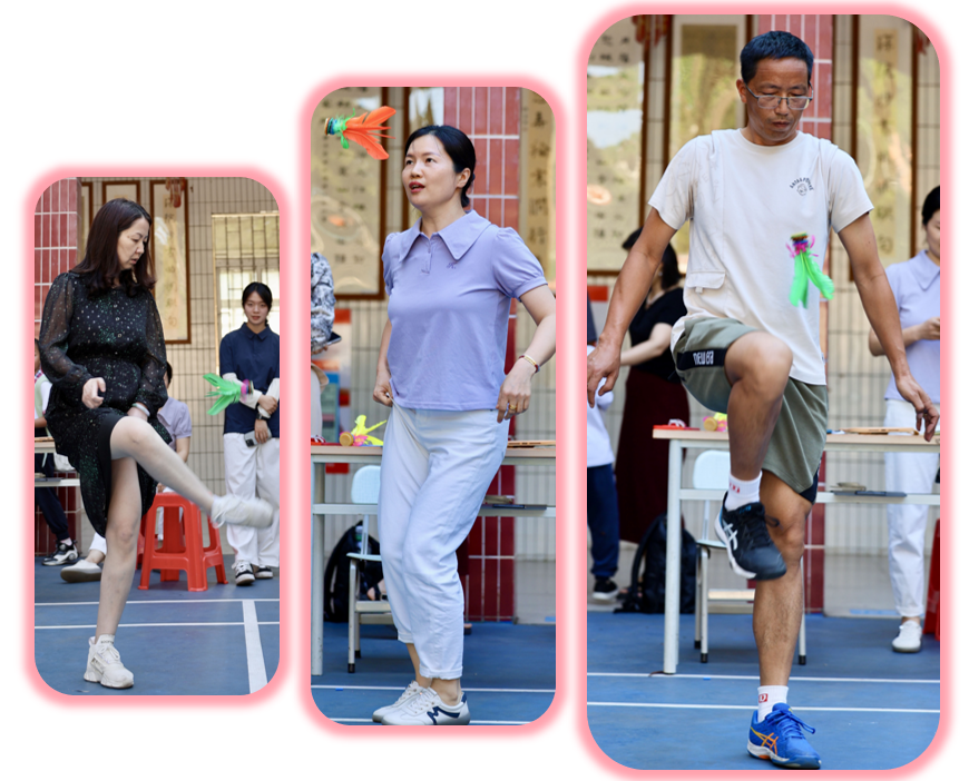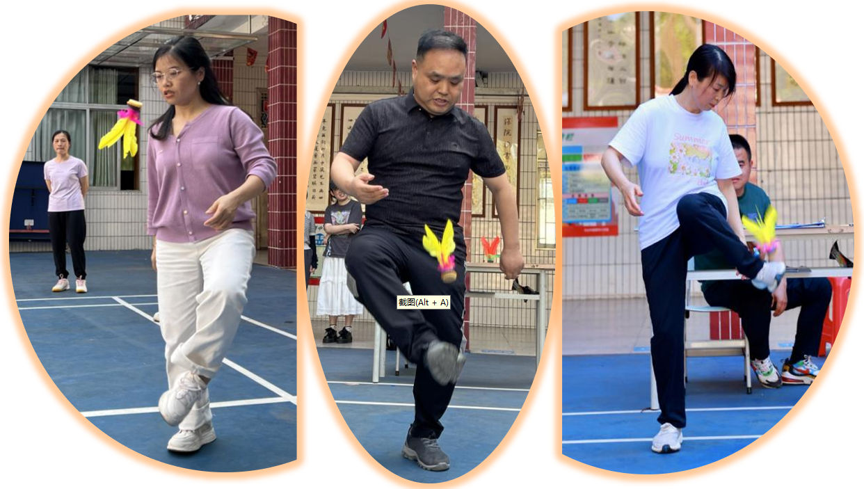 赛事分三阶段:清明之后,各年级组悄然蓄力。庑廊庭院间,毽影翩跹,课间操时分常见教工们切磋“足上功夫”。一年级组罗燕维老师笑言:“此技可比批改作业,眼明如炬,脚快如电,心细若丝,三者缺一不可!”