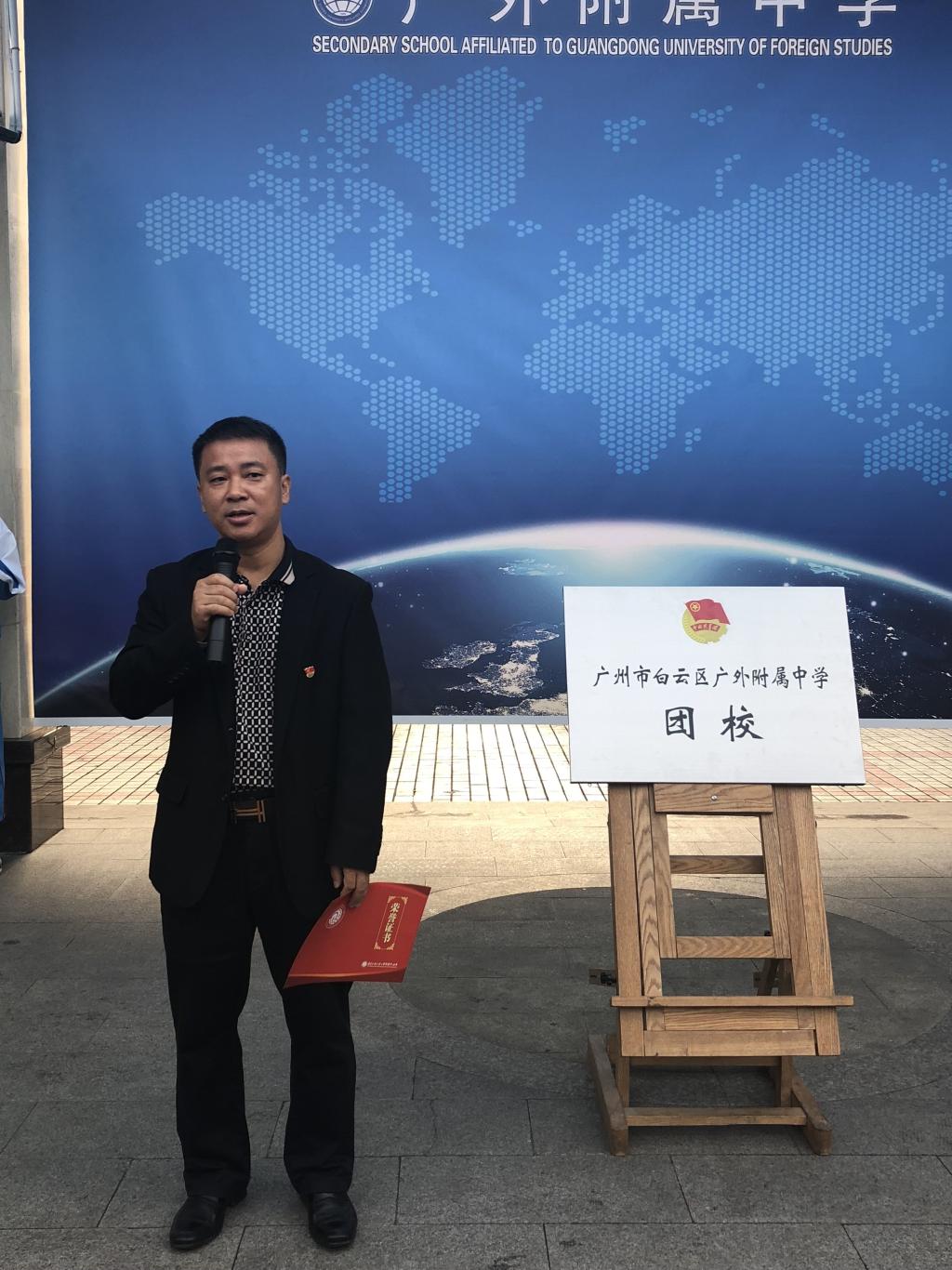 在庄严的国歌声中,活动正式开始。首先,党支部陈又新书记宣读了《关于广州市白云区广外附属中学团校挂牌成立及机构人员设置的文件》。